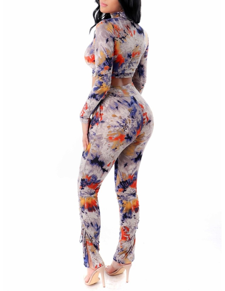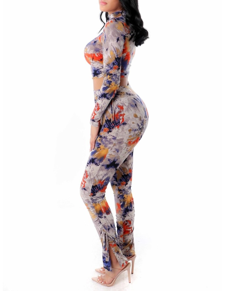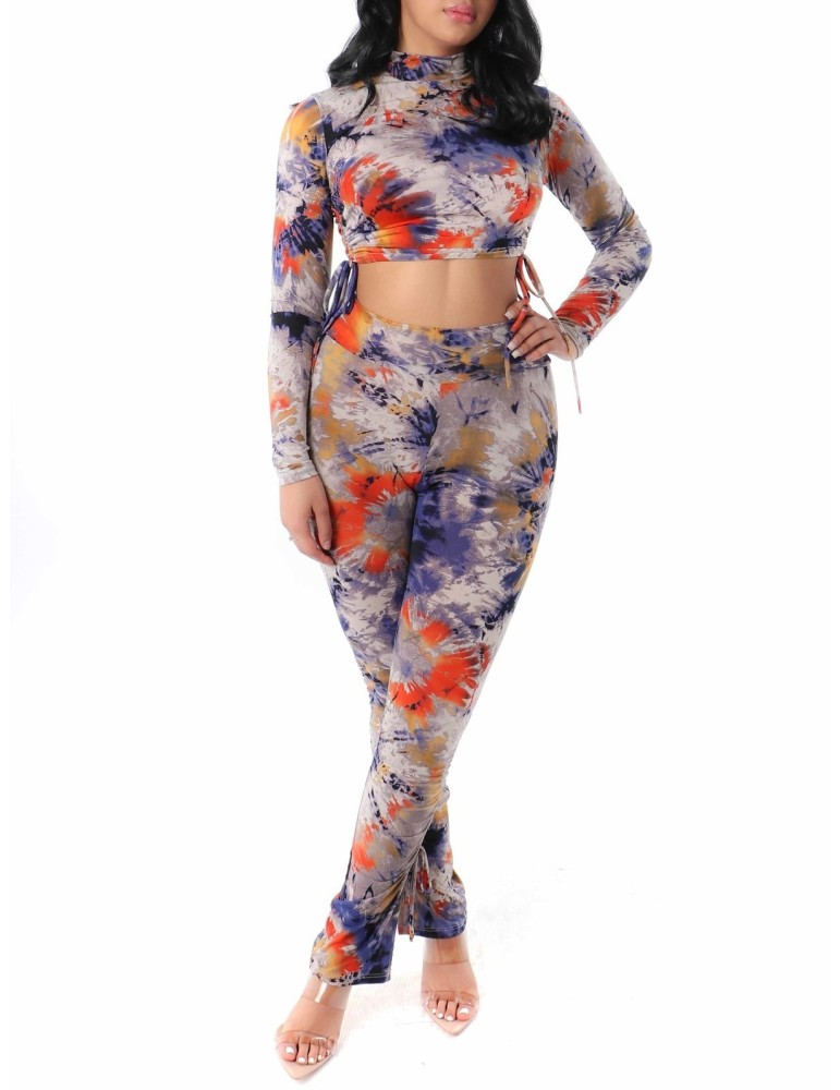 Print detail mock neck long sleeve adjustable strap top and elastic waist long leg pant with slitted 2piece set.