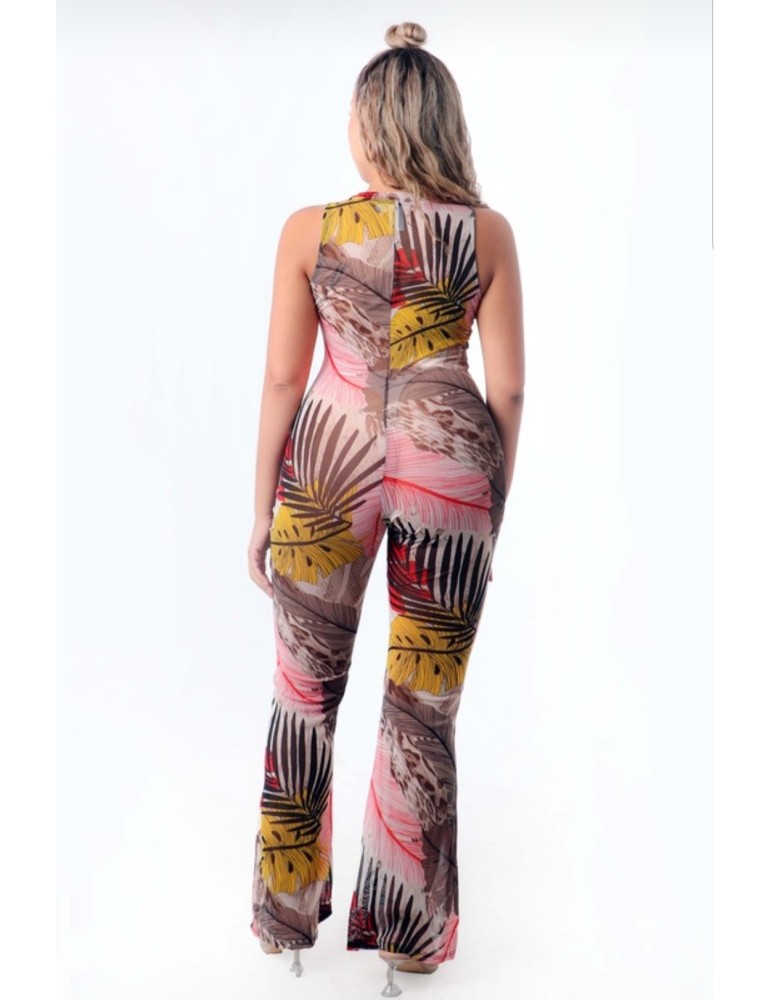 Mesh mock neck front zipper sleeveless wide jumpsuit.