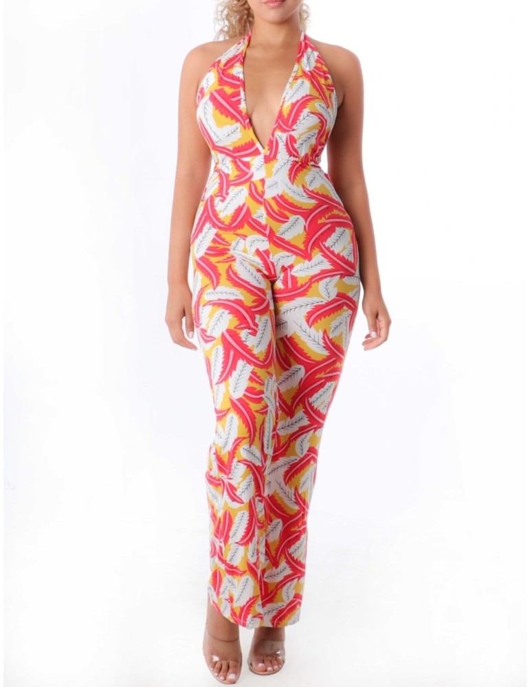 Floral halter jumpsuit sleeveless stretch deep v neck with an open back.