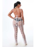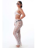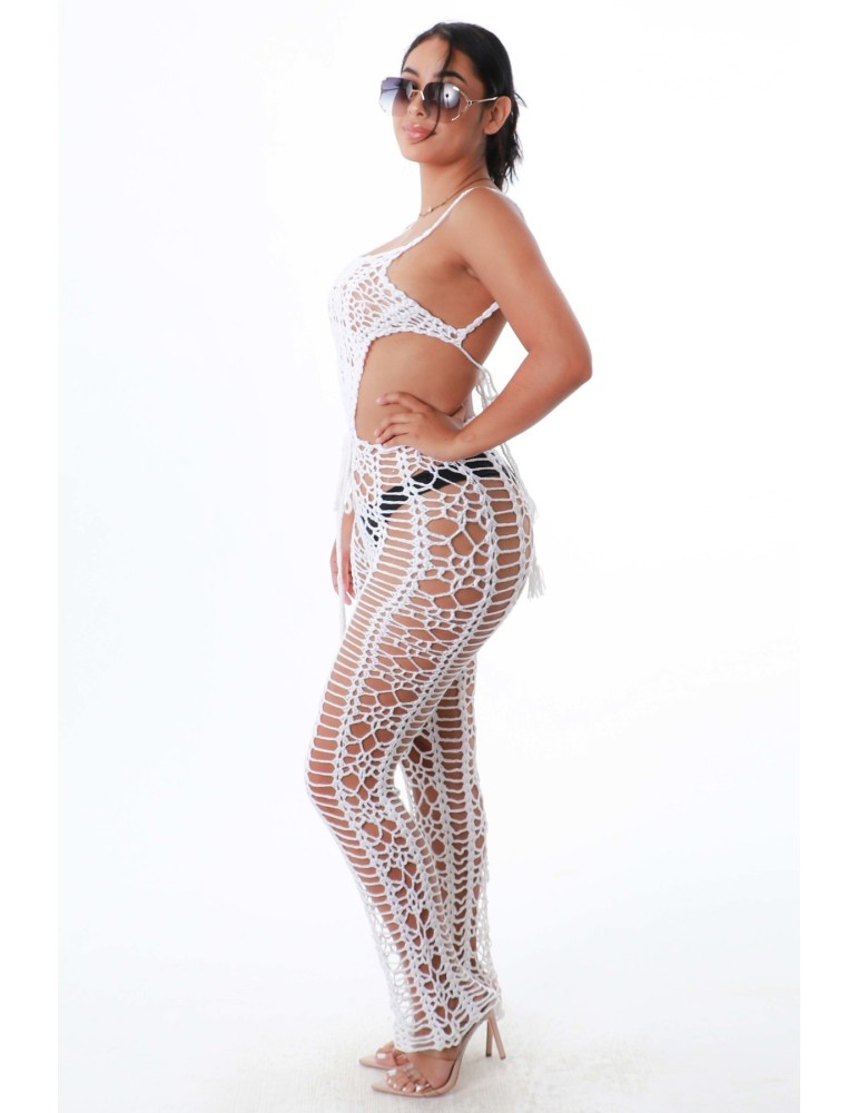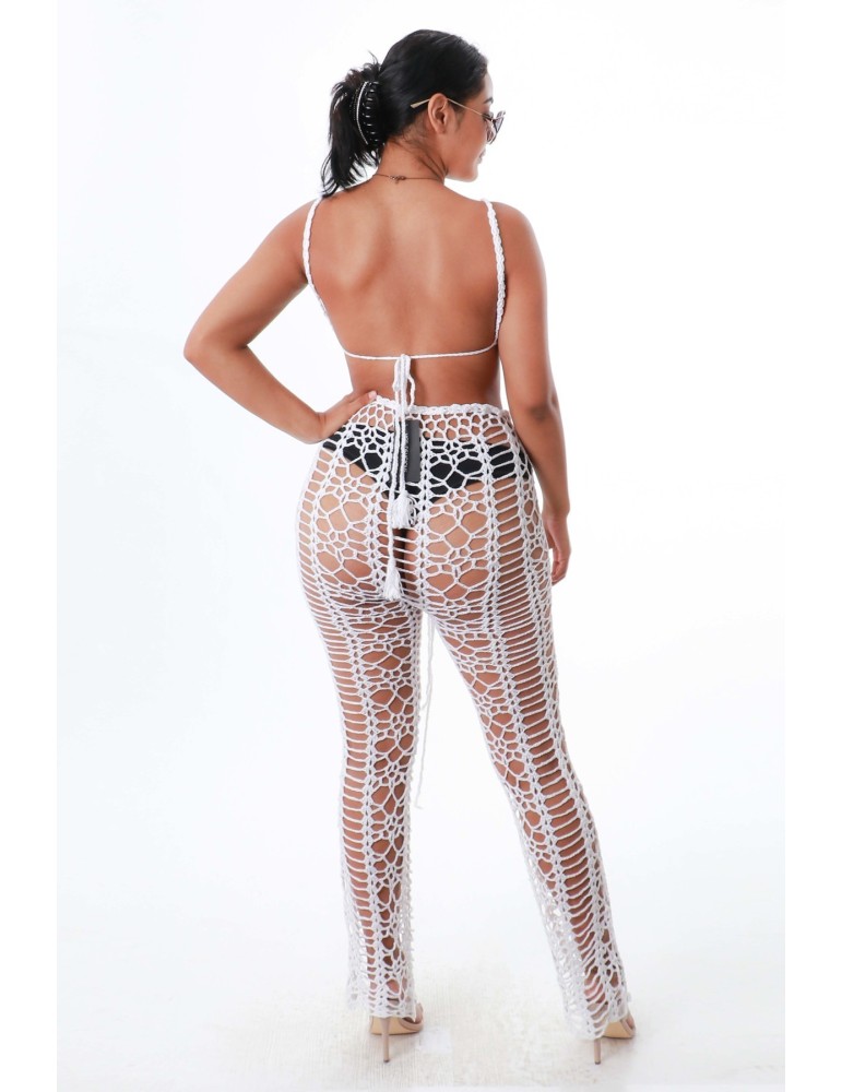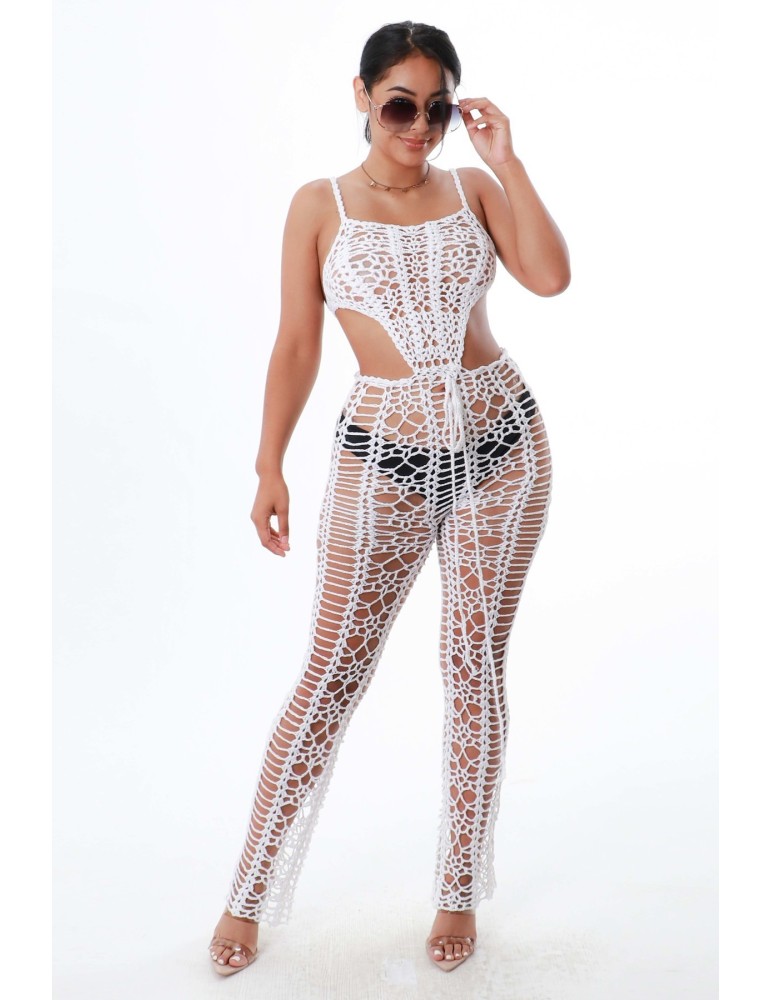 Solid crochet sleeveless jumpsuit with open back and rear tie.