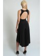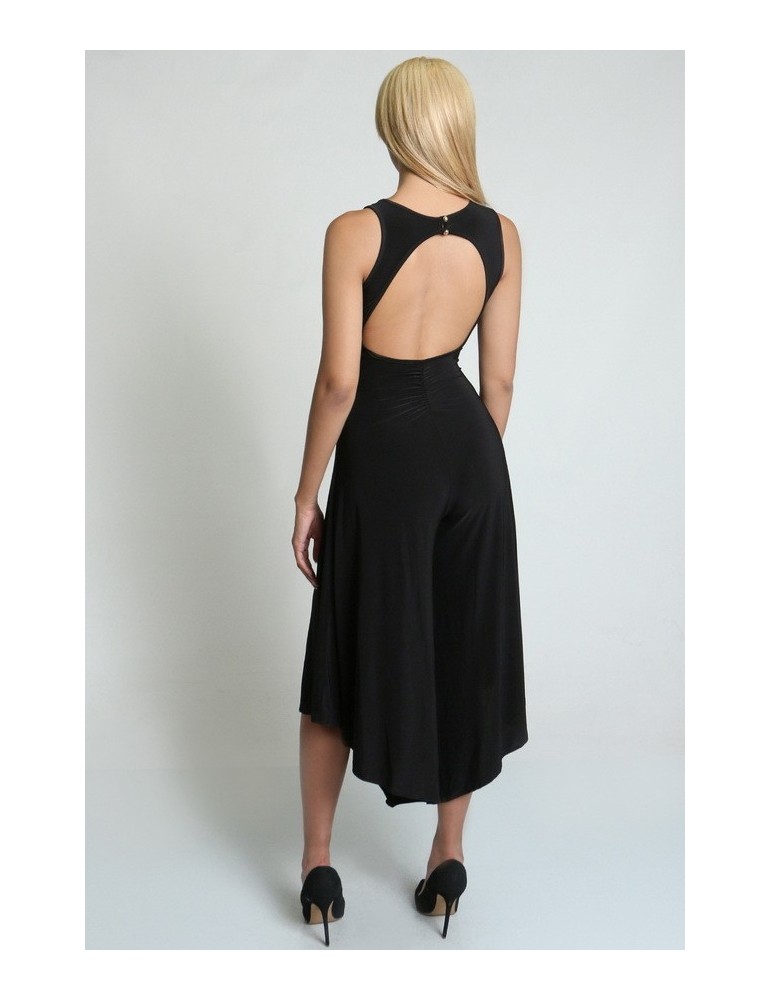 Sleeveless jumpsuit with string crossed accent on the front, open back secured with button. Wide legs pants.