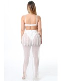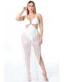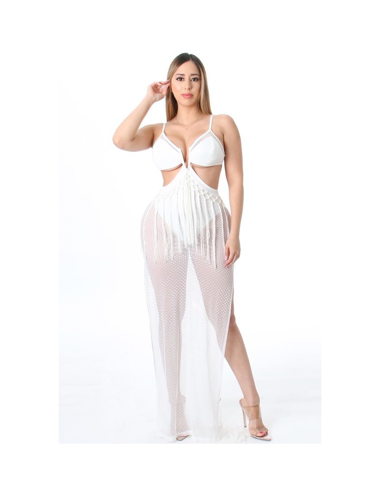 Solid crochet halter neck, sleeveless see through mesh open back slitted stretchy dress.
