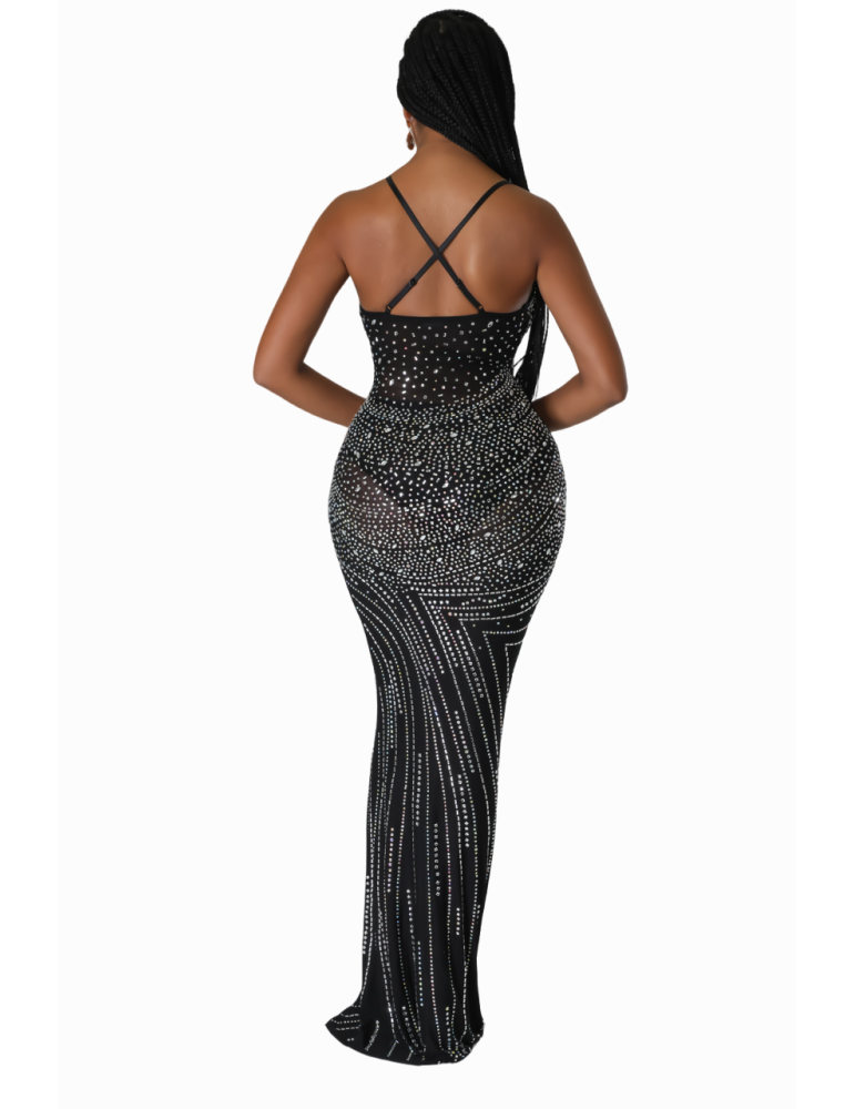 Rhinestones Stretch Sheer Mesh Maxi Dress, Halter V Neck Sleeveless Adjustable Straps Sheer, included Side zipper closure.