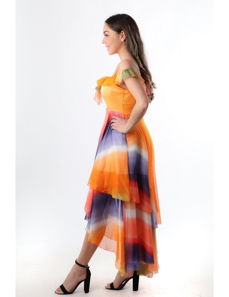 Paint brush tie dye adjustable spaghetti strap multi layered long maxi dress with soft lining and V-Wired bra pad inserted, come with hidden rear zipper.