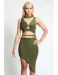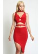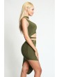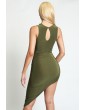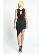 Sleeveless mock neck cut-out bodycon dress with knotted accent on the front, high-and-low wrap style skirt, open back secured with button.