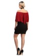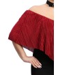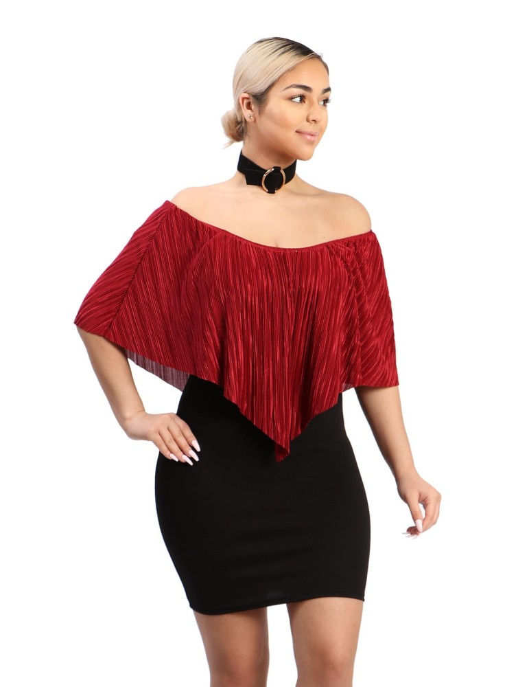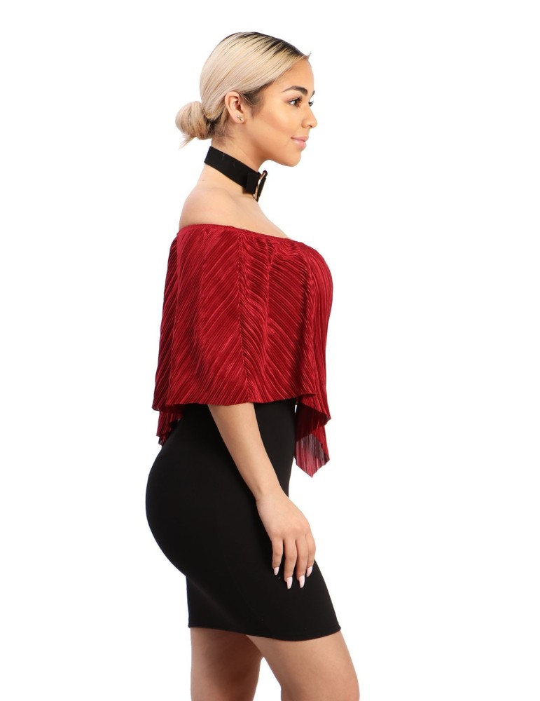 Short sleeve bodycon off shoulder dress with pleated cape layer, thins elastic band around the shoulder for control.