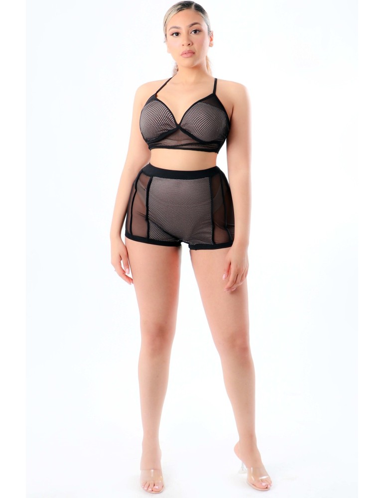 Mesh panel spaghetti strap top and mesh short pant 2pc set.