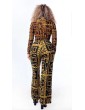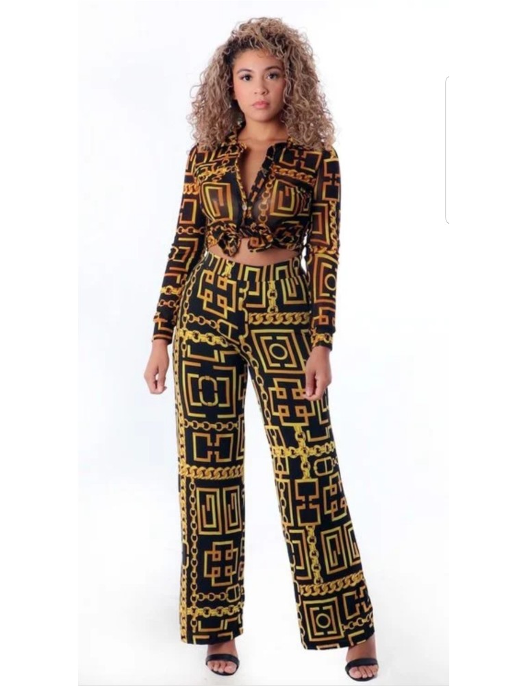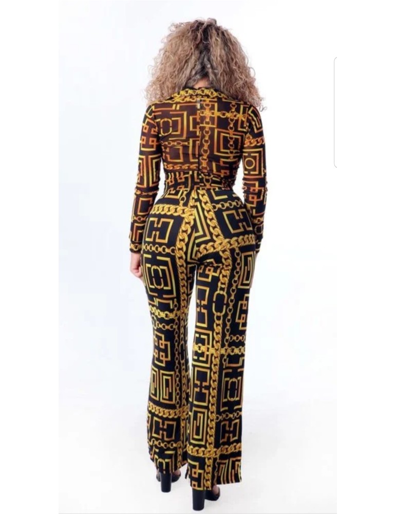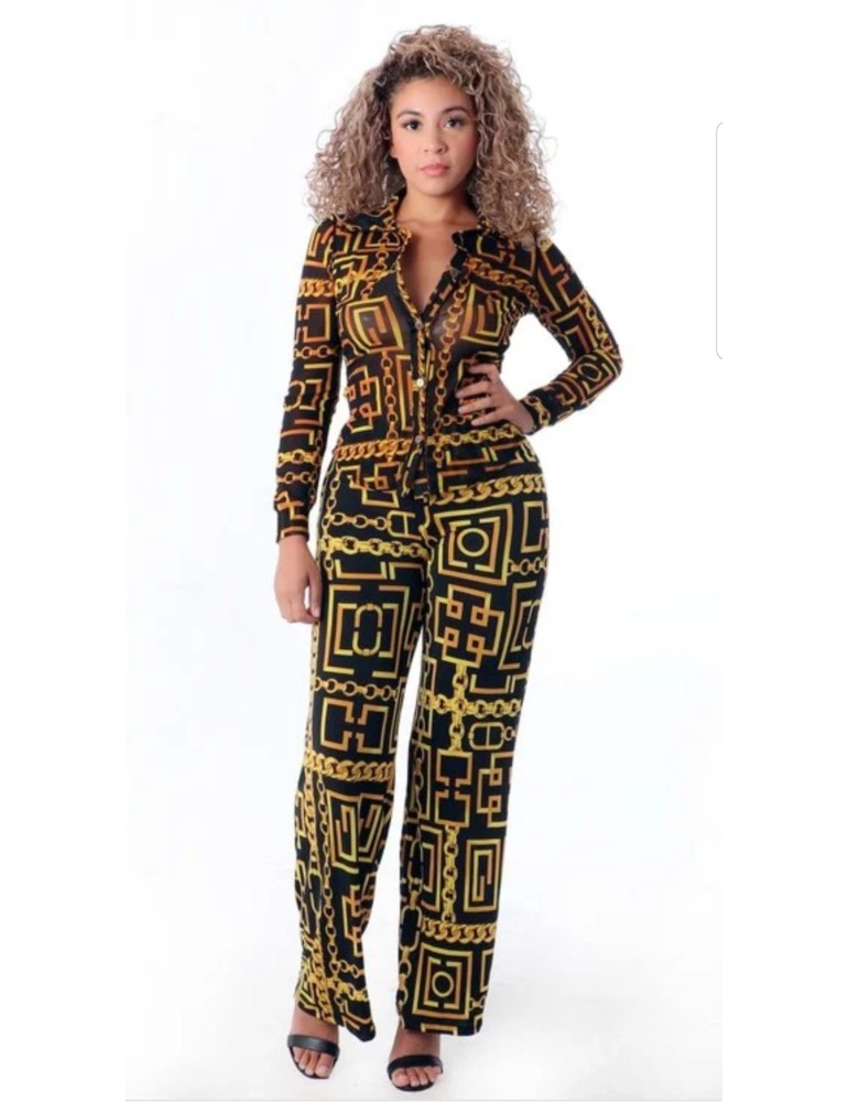 Multi shape printed 2piece set including long sleeve button down bodysuit and matching wide leg pant.
