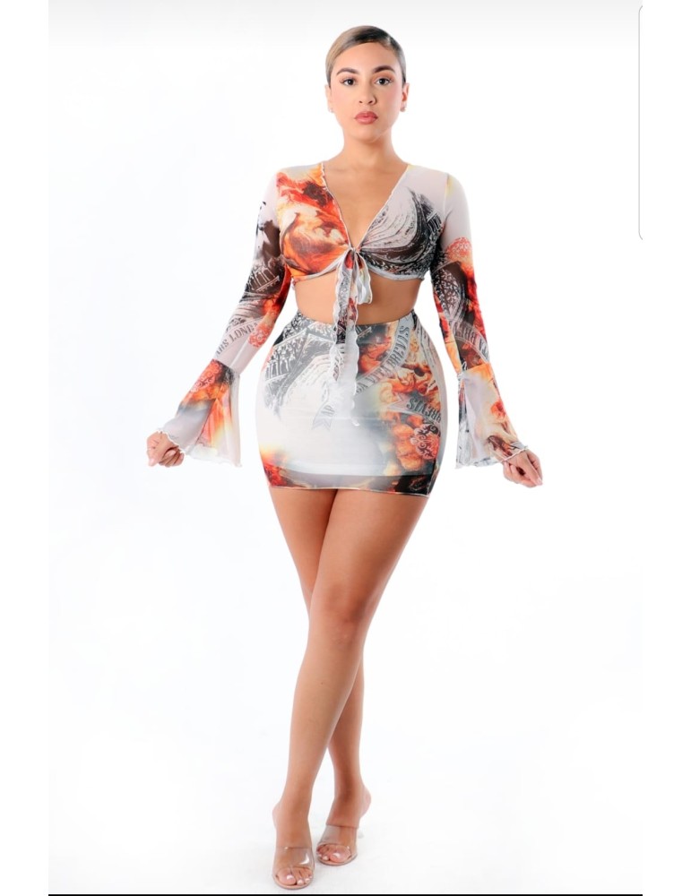 All over stretches long sleeve v-neck front tie crop top and high waist pencil skirt 2pieces set.