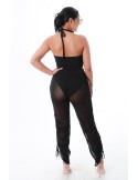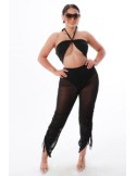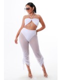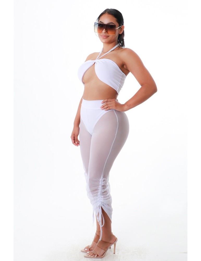 Halter neck sleeveless bikini like top and mesh pant with lining and shirring on both sides.