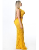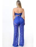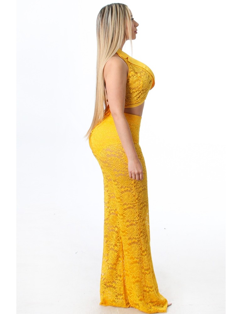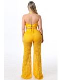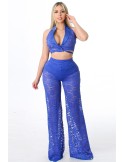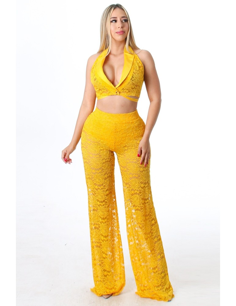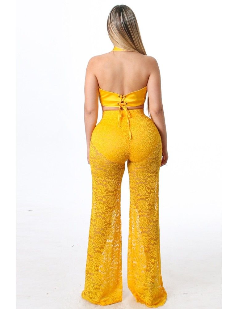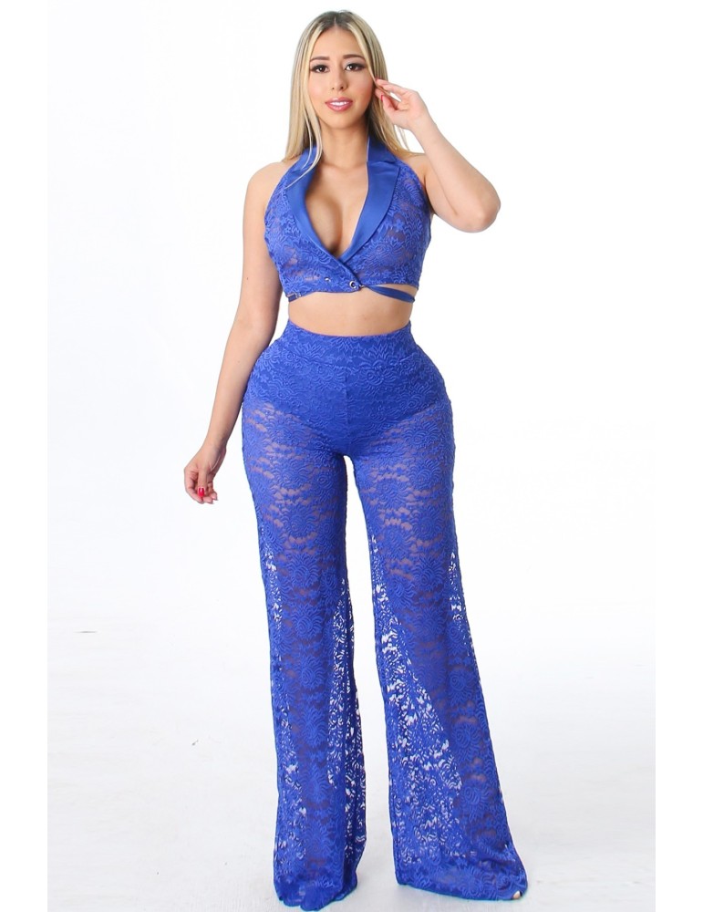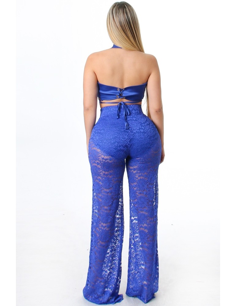 Adjustable spaghetti strap lace panel fashion crop top, high waist wide lace leg full length pant 2pc set.