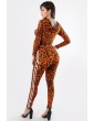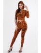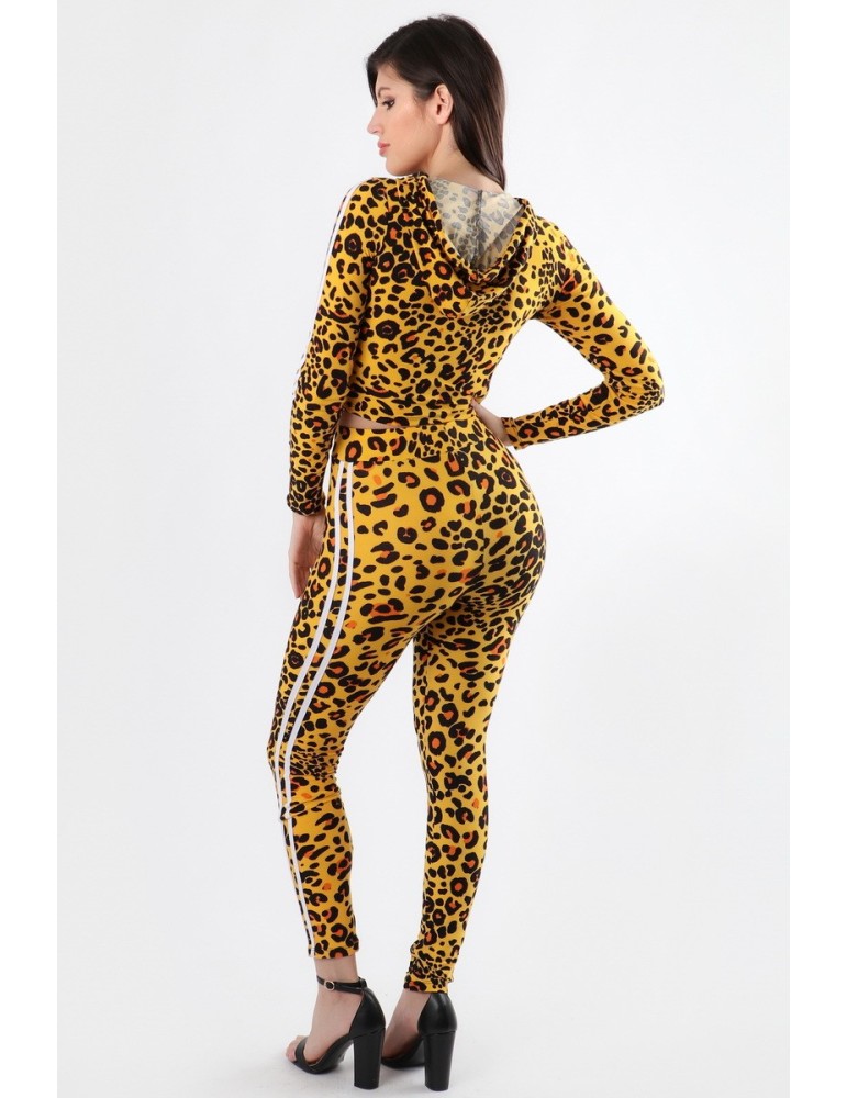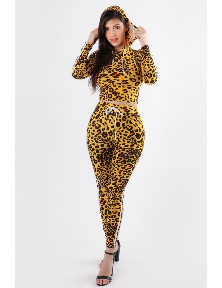 Leopard pattern design all over long sleeve hoodie crop top and matching legging pant 2pc set.
