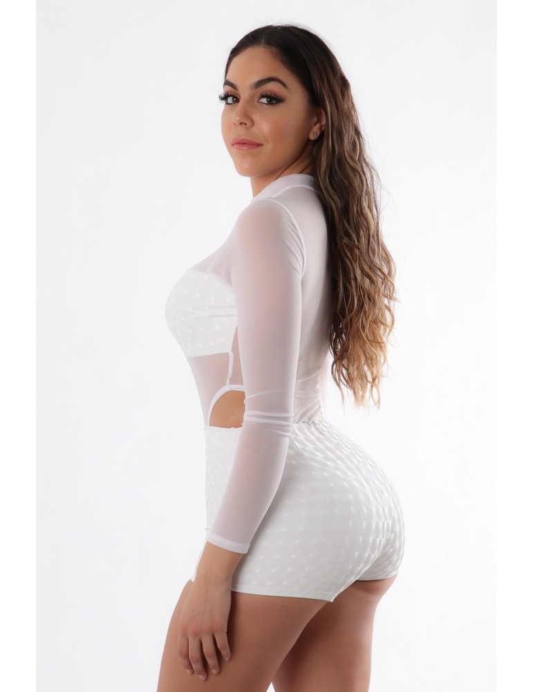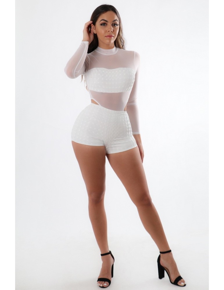 Solid color mesh long sleeve mock neck bodysuit with 3dimensional pattern trim, it come with 3D pattern short pant as a 2pc set.