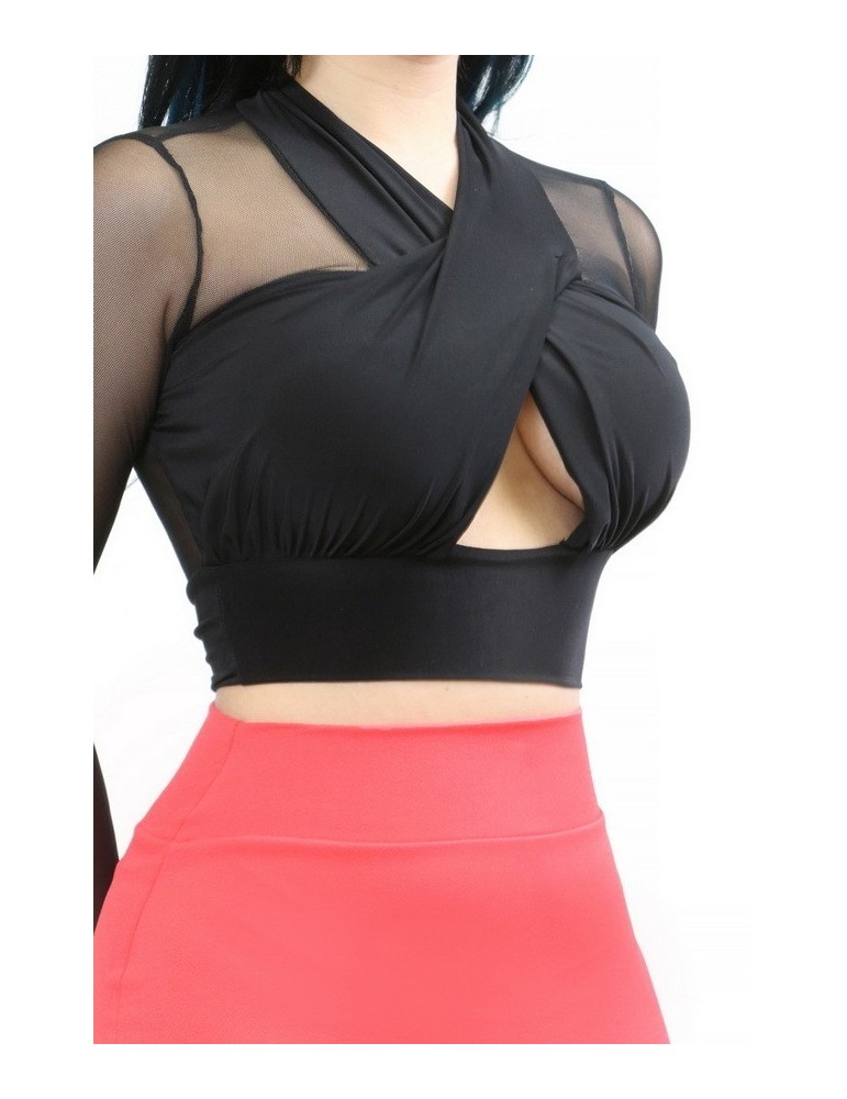 Long sleeve mock-neck cropped top with see though mesh sleeve and back, Crossed fabric open key hole front.